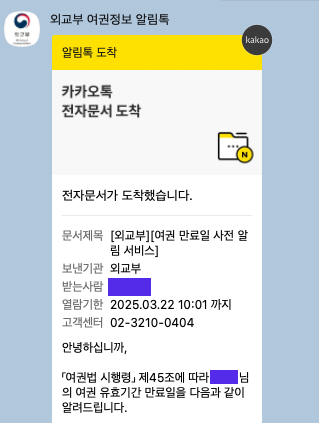 얼마 전 외교부에서 여권 만료일 사전 알림 서비스 카톡을 받았습니다.